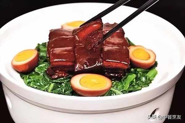 5.走菜时,取一份入蒸箱蒸热,汤汁收浓浇在肉上,底下可以垫焯水的蔬菜解腻,搭配烧好的鸡蛋即可(鸡蛋与花雕酒一起下锅,烧1小时)。