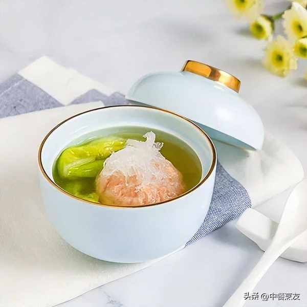4. 原汤过滤用浓缩鸡汁、胡椒粉调味,小盅放入狮子头,盖上焯水过的白菜叶,加入原汤蒸5分钟取出,白菜叶推入汤里,另在狮子头上放少许煨好的燕窝即可。