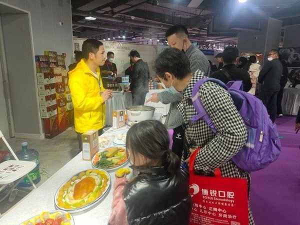 “我们御膳汤是以健康、药膳、养生为主的,各类火锅、汤锅都可以煮,煮面煲粥都行。我们现场还准备了水果等食材,可以品尝感受一下。”御膳汤工作人员的现场烹调,引来不少逛展市民尝鲜。