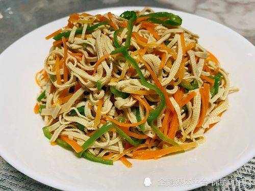 1、千张用开水烫过,切成一寸长细丝,并准备好青红椒丝和姜末,大豆蛋白事先要用冷水泡软,挤干水分,切细丝备用,金针菇切成两段。