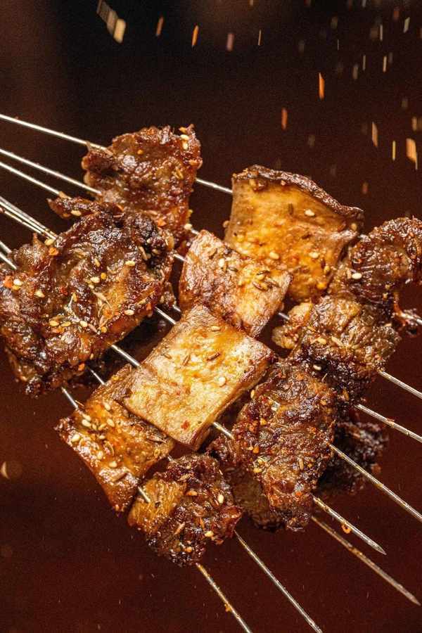 这一口下去,雪花牛肉边缘被烤的焦香,脆、嫩、爽集于这一块肉上;第二口便是杏鲍菇了,吸走牛油的它一口爆汁,牛油香迅速充斥口腔,比肉还好吃不是吹的!