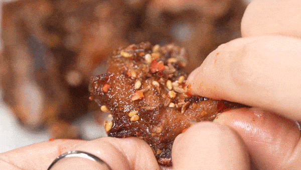 鸡架上撒了细细密密的孜然和辣椒粉,再在铁篦子上反复熏烤,不说十里留香,反正准让你吃到嗦手指。