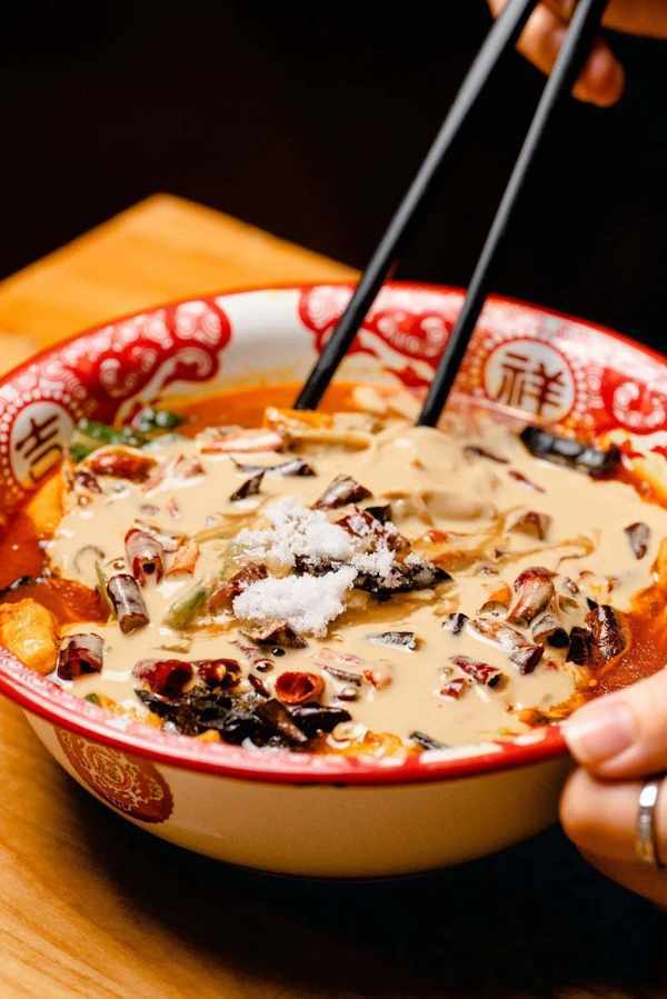 汤底是淡淡的中药味道,配上秘制辣酱,再来点儿小糖粒提鲜。筷子一拌黏黏糊糊,这滋味别提多美了!