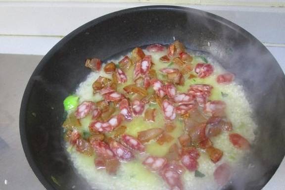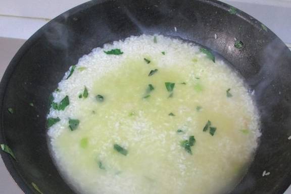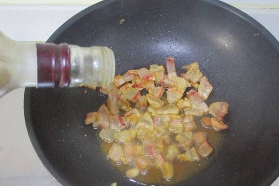再把大米倒入炒匀后加入清水,水量要比平时烧白米饭少一些