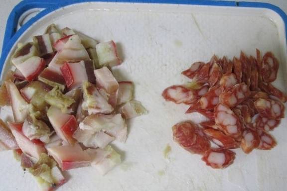 再把咸肉和香肠加在表面盖上大火烧开后转中小火
