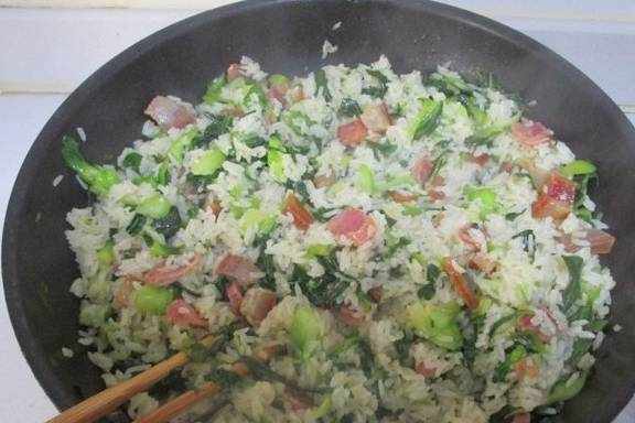 温馨提示;1.不同的大米涨性也不一样,水量依照自家的大米而定2.炒青菜的时候先尝试一下味道再加盐调味,味道比平时炒菜要咸一点才够味3.咸肉是我自己腌制的不是超级咸的那种,太咸的先要用清水泡去一部分咸味再烹饪味道更佳。