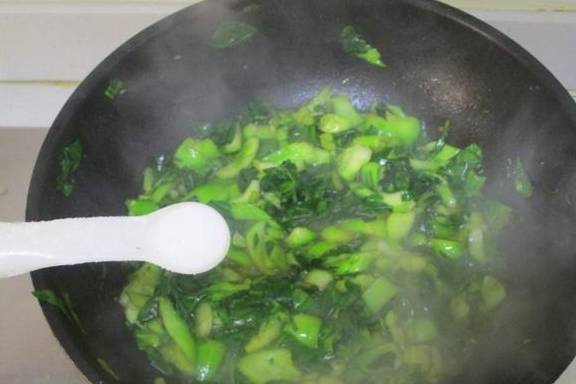 再把青菜倒入不断的煸炒出水分后加盐调味后盛起