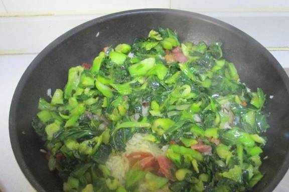 烧制米饭已经涨开,差不多九分熟的时候再把青菜加入后再盖上