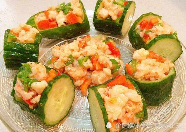 4、将炒好的菜肴装入黄瓜盅里面,即可食用。这道菜摆盘似两棵竹子,非常好看。