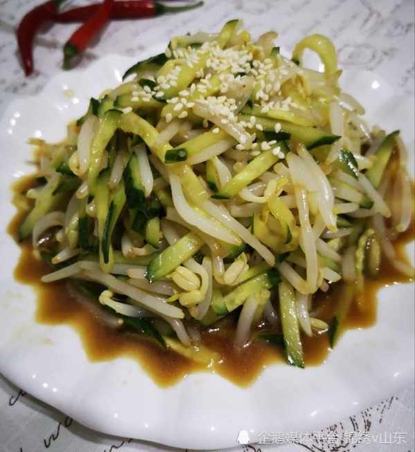 2.豆芽过凉水捞出,放入大碗中,黄瓜切丝放入大碗中。加入蒜末。加入生抽两勺。加入蚝油适量,醋一勺。加入辣椒油一勺,盐和糖少许,搅拌均匀即可