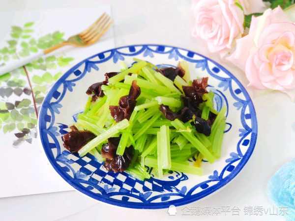 食材:芹菜360克、白木耳80克、辣椒3个、盐1勺、生抽1勺、鸡精少许