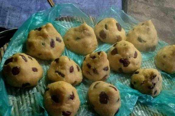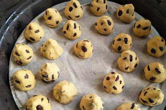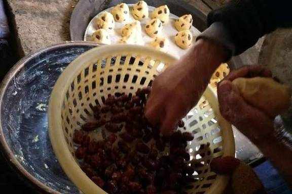 拿起玉米面揉成圆球,在上面按红枣。一个面团按了十个小红枣就差不多了,之后用力团结实,成枣球啦。