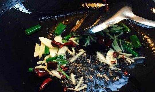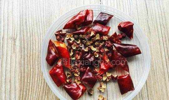 4.热锅倒油,油热后放入花椒粒和干辣椒炸香,再放入葱姜蒜炒出香味。