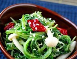 海带清拌萝卜苗做法:1.海带水发后煮熟、过凉控水。2.萝卜苗摘净洗净、控水。3.枸杞子洗净,用水泡软备用。4.大葱去皮切丝。5.净锅入油,凉油将花椒粒下锅小火炸成花椒油。6.将所有食材与所有调味品合拌均匀即可食用。