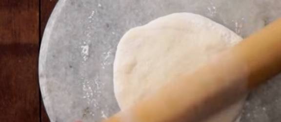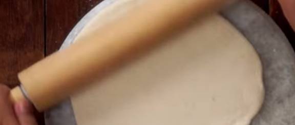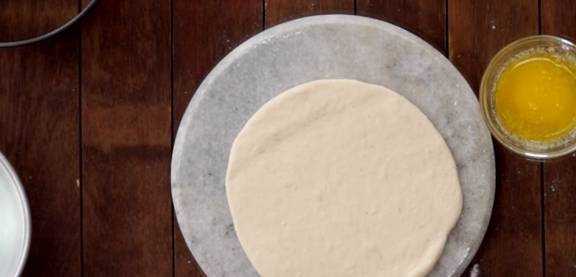 把面团揉面排气,分割成两半,擀成1厘米厚度的圆饼。