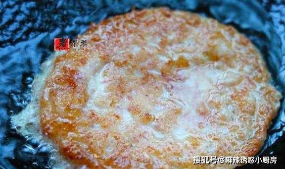 步骤6,糯玉米糊下锅后,别翻动它,等待3分钟左右,翻面,继续煎,直到两面金黄焦香以后,用锅铲铲出来,装盘即可。
