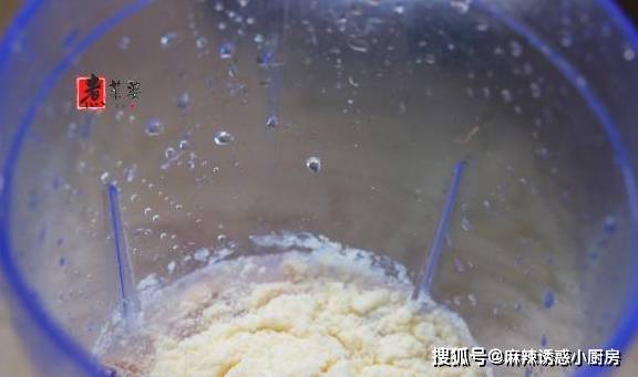步骤2,拿出家里的榨汁机,把洗好的玉米粒倒入杯体中,倒入1袋甜奶粉(25克)、半纸杯清水。盖上盖子,启动榨汁。注意:水不要加入太多,因为面糊太稀后很难成形,会大大增加失败的概率!如果一时手抖,加的水有点多了,那就把玉米糊过滤一遍,留下玉米渣部分,加入糯米粉和玉米汁混合成面糊。