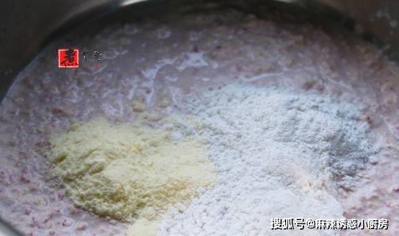 步骤3,大概5分钟左右,糯玉米粒已经全部变成了浓稠的面糊状。这时候,拿出一个大一点盆,倒入榨好的糯玉米糊,加入1袋甜奶粉、1纸杯半糯米粉、2勺冰糖粉。