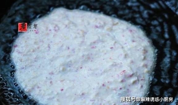 步骤5,重点来了!这道美食的成败关键就在于此!铁锅中倒入稍多一点的油,中火烧热,用手伸到上方能感觉到高温就可以下面糊了。不过,下面糊前,要做的就是调小火力,选择小火就行。然后把不满1勺的玉米糊轻轻倒入锅中,眼睁睁地看着它慢慢变金黄。