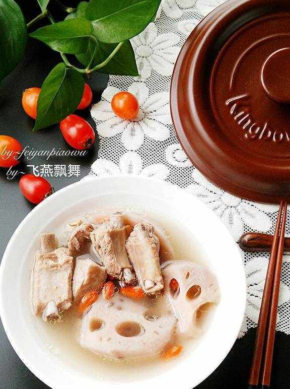 排骨1000克,莲藕2节,盐适量,开水适量,生姜1块,枸杞子少许,黄酒适量,