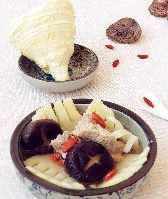 春笋250g,排骨500g,香菇50g,盐适量,白胡椒粉适量,枸杞适量,