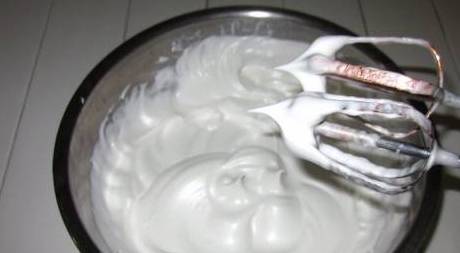 步骤3:高速搅打至可拉出尖角的干性发泡状态,再转慢速一分钟使蛋白糊变得光滑细腻。