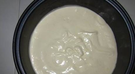 11.倒入搅拌好的东西,然后蹲几下锅,把气泡震出来