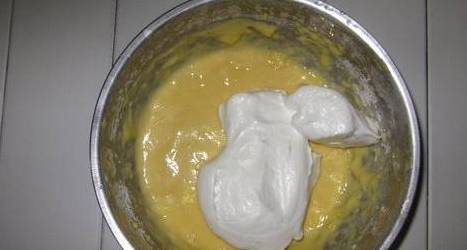 步骤8:取三分之一打发好的蛋白加入蛋黄面糊中,用橡皮刮倒翻拌均匀。