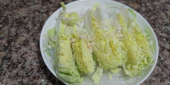 4、粉丝捞出放盘内,放上切好的娃娃菜,撒上蒜末,我还撒上些虾皮,没有的可以不放。