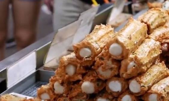 其实这小吃的主要原料是鱼肉,和香肠,年糕,把剔除鱼刺的鱼肉里面加上那个调味料,和少许的青菜,然后把青菜和鱼肉放在一起,剁成泥,然后把香肠或者年糕,包在鱼肉泥中!
