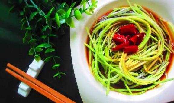5.将辣椒油同提前调好的酱汁混合,浇在西葫芦丝上即可食用