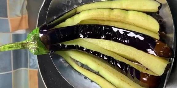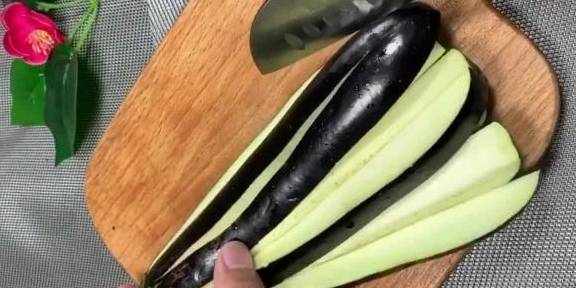 1、将整根茄子入锅炸,其实是为了让菜品的卖相会更诱人一些,大家可以将它切成段,或者滚刀块,吃起来效果一样。