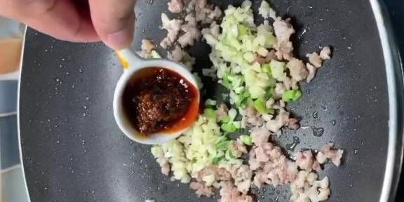 3、锅中留少许的底油,油热后,先放入少量的肉末,将它滑散、滑至变色后,再倒入适量的葱姜蒜末,以及半勺的豆瓣酱,再来半勺蚝油,小火炒香,炒出红油。