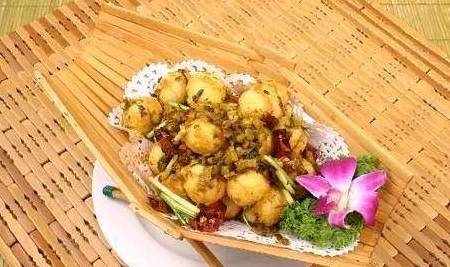 3、锅内留油烧至五成热,下入干椒节慢慢煸香、煸脆,再下入酸菜末炒香,然后投入炸好的汤圆快速翻炒,至汤圆外皮能裹上一层酸菜末时,装盆即可。