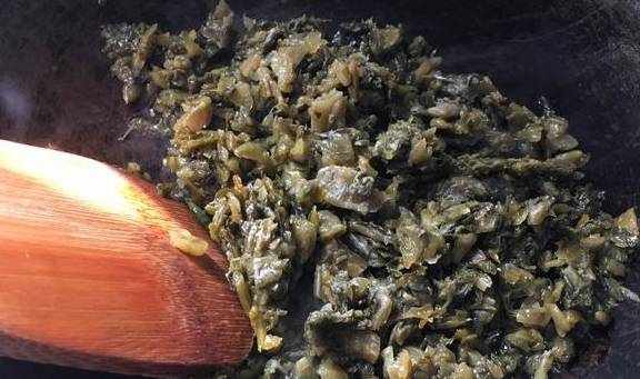 1.起锅热油,油温升高后倒入腌菜,因为是从冰箱里拿出来的,所以要先翻炒加热。