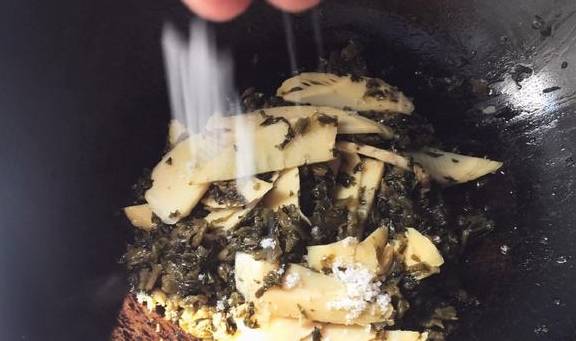 2.放入冬笋,炒均匀。腌菜自带咸味,无需放盐,只要加点糖调味即可。注意糖不要放多,最好是用手指捏一小撮,转着圈均匀地撒在食材上。