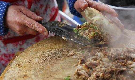 馍外观焦黄,条纹清晰,内部呈层状,饼体发胀,皮酥里嫩,火功到家,食用时温度以烫手为佳,且老潼关肉夹馍是热馍夹凉肉,饼酥肉香,爽而不腻)