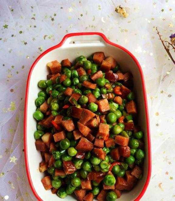 在南方呆了多年,鲜嫩的嫩豌豆荚真的很少见,菜市场买的,只能是剥米出来料理着吃,壳都很老,没办法吃的。夏天,趁着豌豆荚大量上市的时候,精灵一下子买了好几斤,全部剥出来放冷冻层,想吃的时候拿出来一些,荤炒素炒,都好好吃。今天要推荐的菜:豌豆米炒红肠。冰箱中仅存的一根红肠,舍不得吃也要拿出来给冰箱腾地方,哈哈。切成小丁的红肠,配上豌豆米,再撒一把辣椒碎末,简单的炒一炒,荤素搭配好吃又营养,我们全家都好喜欢吃呢;特别是小朋友,直接拿勺子舀一些放碗中,跟米饭拌匀,吃得特别香,一眨眼的功夫,一碗饭就见底了。孩子最馋这菜,三两下出锅,鲜香开胃又营养,拌米饭能吃三碗,一起来看看具体的做法吧~