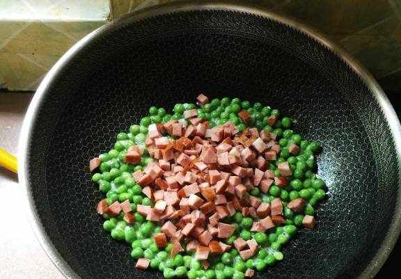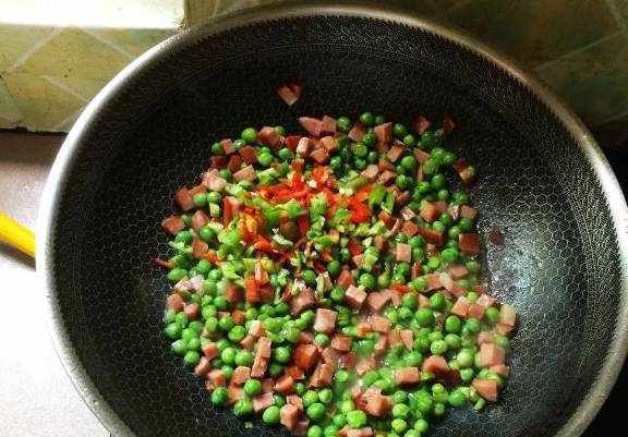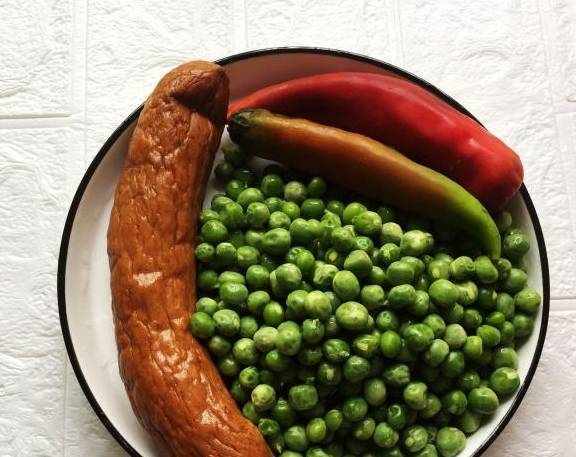 原材料:红肠1根,豌豆米300克,辣椒2个