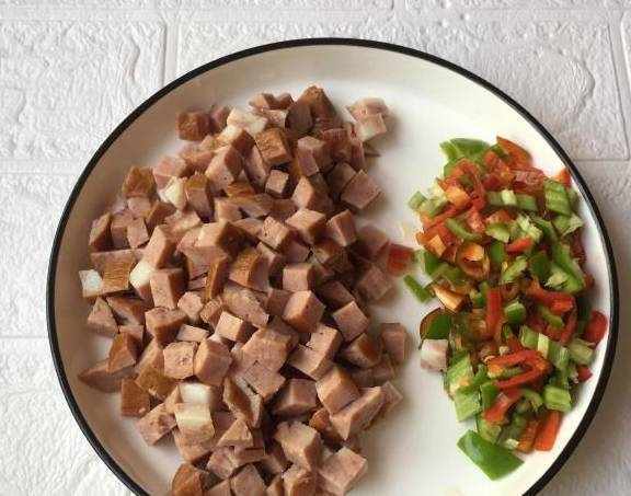 2:辣椒去籽切碎末,红肠洗净切小丁。