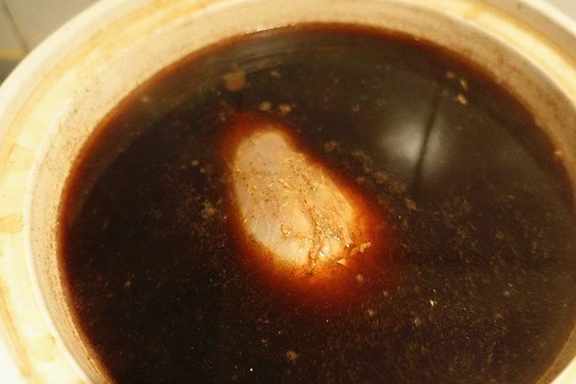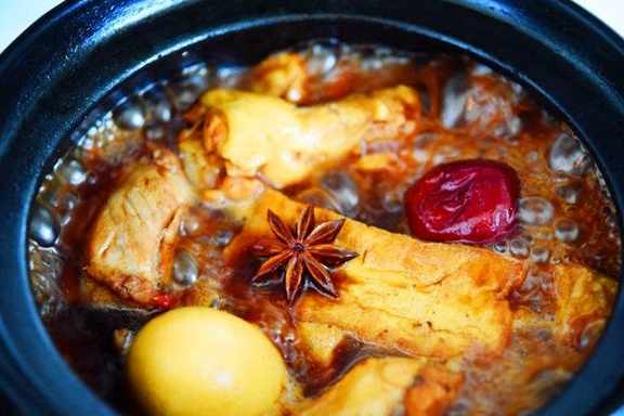 5、高湯煮好後把雞骨架或者猪棒骨撈出來,然後加入包裹好的香料包、炒好的糖色、生薑、香葱、黃酒和食鹽,大火燒開後用小火慢煮1個小時即可,這樣鹵水就做好了,需要鹵什麼食材直接加進鹵水裏煮熟即可。