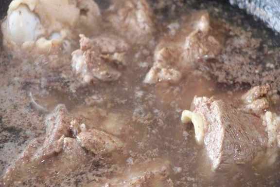 4、雞骨架或者猪棒骨用刀敲斷,先焯一下水,撇去浮沫,然後放到鍋裏,加入清水和食醋,開大火燒開,然後慢慢燉煮2個小時做成高湯。