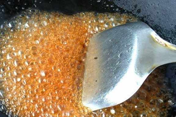 3、鹵水一般分為紅鹵和白鹵,我個人比較喜歡紅鹵,所以就需要炒一下糖色,如果需要白鹵水的朋友可以减少這一步。鍋燒熱後加入少量清水,加入冰糖,用小火邊熬邊翻炒,炒至冰糖全部融化,顏色變成深黃色起泡時就可以關火了。