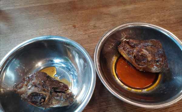 他们家的兔头有麻辣和五香两种,都是12元一个。麻辣兔头的制作非常耗时。首先,兔头需要用姜片、葱结、盐、料酒等腌制几个小时,然后清洗干净,放入沸水中取出备用。麻辣兔头中最重要的是麻辣卤汁。它由树叶、花椒等20多种香料,将加工好的兔头放入麻辣卤汁中制成。头准备好了。