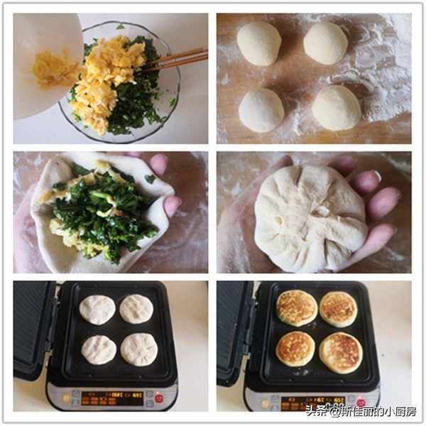 7. 将炒好的鸡蛋放入其中拌均匀;8. 玉米面团分割成大小合适的面团; 9. 擀成圆饼后包入适量的荠菜鸡蛋馅料; 10. 将它们捏拢后按压成饼; 11. 电饼铛上下盘刷成油, 预热好后放入馅饼,按下制作葱油饼的功能键; 12. 时间到,将馅饼翻面后继续再煎上一分钟后,馅饼双面金黄即可;