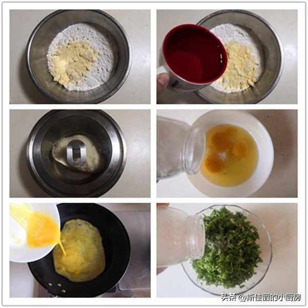 原料: 鸡蛋 3个 荠菜 1把 玉米面粉 1小碗 高筋面粉 2小碗 油盐 适量