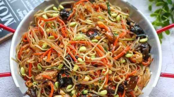 食材:细粉丝一小把、黄瓜半根、胡萝卜半根、豆芽、香菇几朵、黑木耳