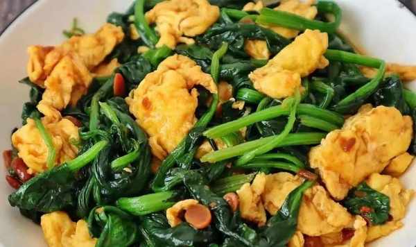 2:打散的鸡蛋先放到锅中炒至定型捞出备用;锅中倒一点油,放菠菜煸炒一下,倒入鸡蛋,加入1勺豆瓣酱翻炒均匀就可以出锅啦