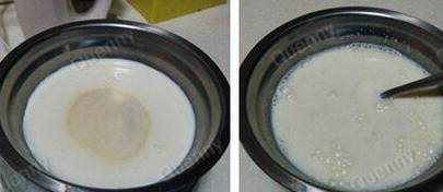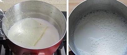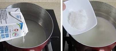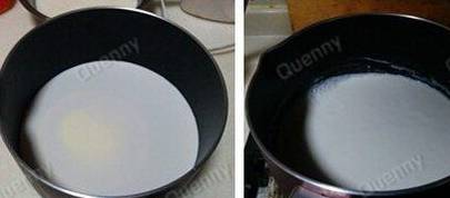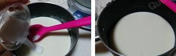 3.倒入奶液,慢慢搅拌至至鱼胶粉全部溶解后关火;