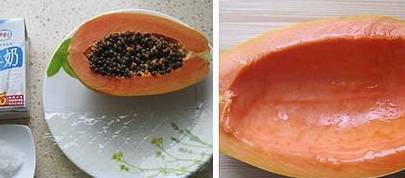 2、木瓜洗净,用勺子挖去籽和少量的果肉。